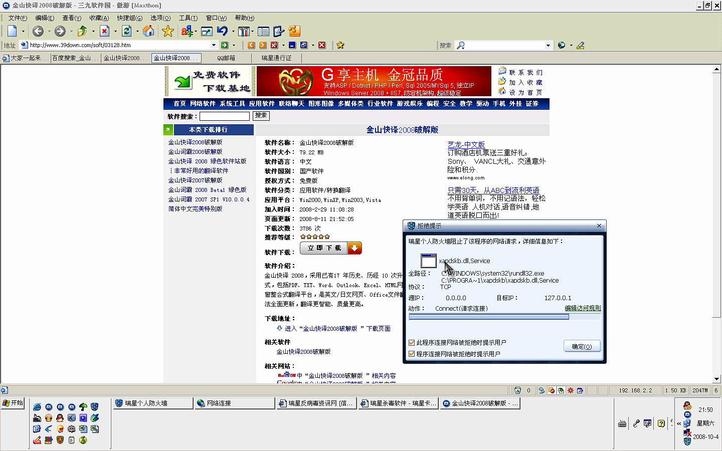 瑞星卡卡安全论坛技术交流区反病毒/反流氓软件论坛 已解决 谢谢 ,上了下面的网下个金山快译2008破解版 自动弹东西出来,自动启动程序杀毒杀不出来任何东西