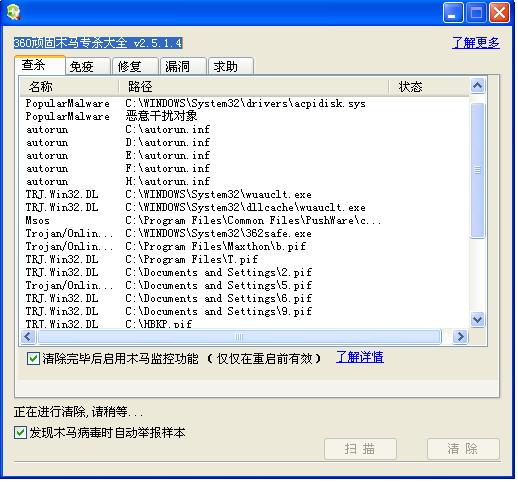 4,用360卫士顽固木马杀毒每个盘下面都有HBKP.pif,木马是TRJ.WIN32.DL。
