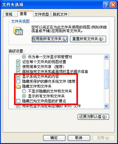 3、重装系统并登录WINDOWS后,双击“我的电脑”--工具--文件夹选项--查看,按照下图完成设置: