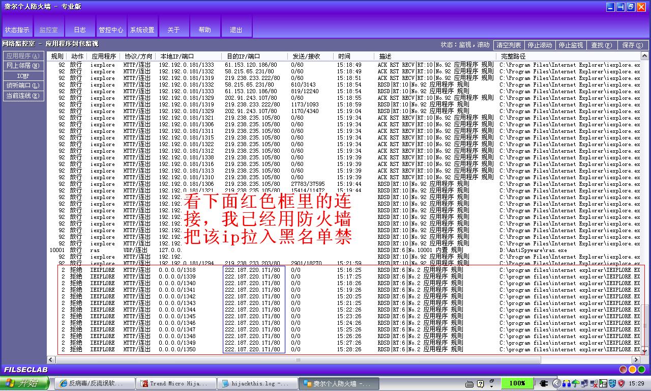 前几天发现可疑IE进程,开机自动启动,用户名为SYSTEM,一直连接一远程ip:222.187.220.171,怀疑为灰鸽子,但按以前教得手工清楚方法发现不了可疑文件。瑞星、360都杀不出来,用了几个专杀也没效果。该进程手动结束后重启之前不会再出现。我现在用费尔的防火墙把该远程ip拉入黑名单了。