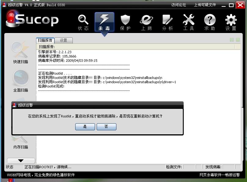 用超级巡警扫描时老是出现在ROOTKIT,请问他有没有什么危害如何能清除它,用超级巡警重启也不好使。