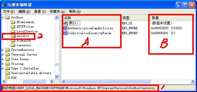 进入注册表编辑器,按照下图1处的注册表路径,找到并单击2处的注册表项,然后截图上传(【注】A、B两处的内容必须显示完整):
