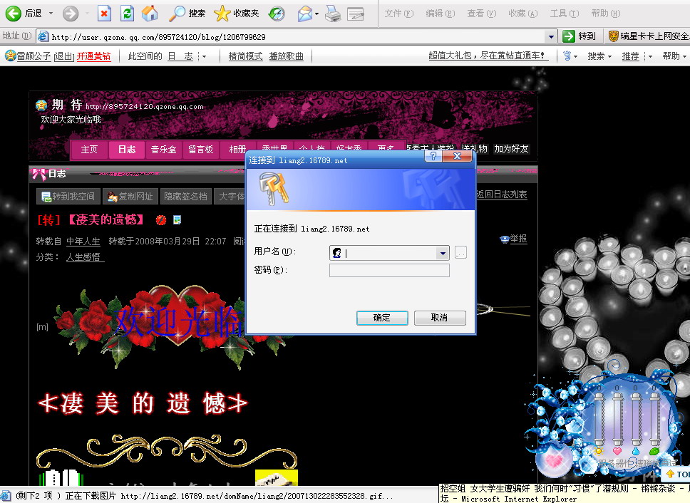 的qq空间时,打开一个日志时弹出了一个连接到对话框,要求输入用户名及密码,这个有些反常哦。所以就来请教大家,这个日志的地址是