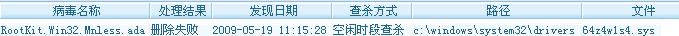 我c:\windows\system32\drivers文件夹下的64z4w1s4.sys文件每次杀毒都有个Rootkit.Win32.Mnless.ada病毒,查瑞星病毒资料库