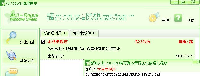 使用Windows清理助手扫描,是木马病毒,也杀不了怎么办啊?高手指点一下,谢谢!