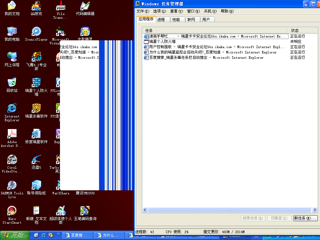 再一个...瑞星杀毒和防火墙在开机后会自动退出(在任务栏里图标会自动消失)..我全部都用修复程序修复了..修复后会出来,但一关机在启动..又会自动消失....