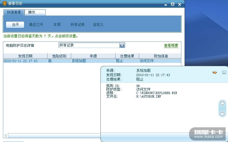 就算没有autorun.inf文件,系统自身的桌面进程也是会执行访问autorun.inf文件的命令的,2010瑞星的主动防御会常规性的阻止其访问autorun.inf文件的企图,并记录日志,哪怕没那autorun.inf文件,也一样阻止一次并记录日志。 也就是阻止并记录一次桌面程序的访问autorun.inf文件的命令。