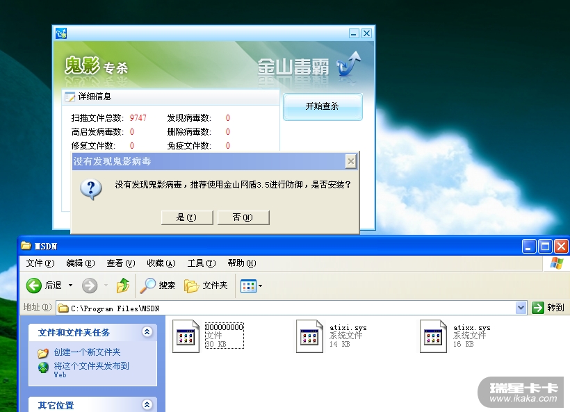3、运行样本后用金山毒霸提供的专杀工具杀毒。它说没有“鬼影病毒”,但让我安装金山网盾(我吃饱撑着啦?图3):