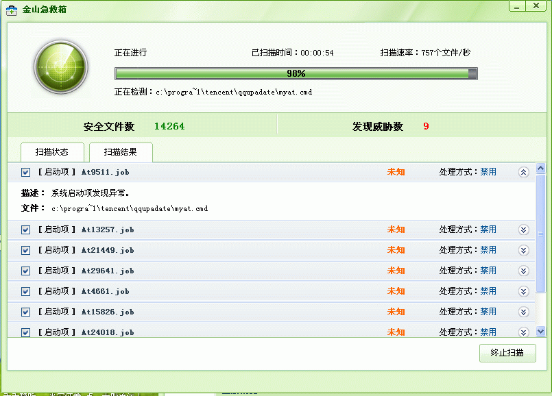 随后使用“金山急救箱”扫描,但每次扫描到98%的时候会扫描出异常,此时“金山急救箱”也会无响应,最后只能结束程序,扫描到98%的时候图片如下,之后“金山急救箱”就歇菜了。