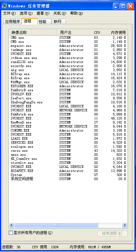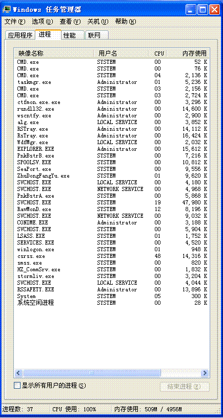 以下3图是CMD.exe发作时的任务管理器截图,CMD.exe反复出现又关闭一会多一会少,但CPU使用率一直是100%