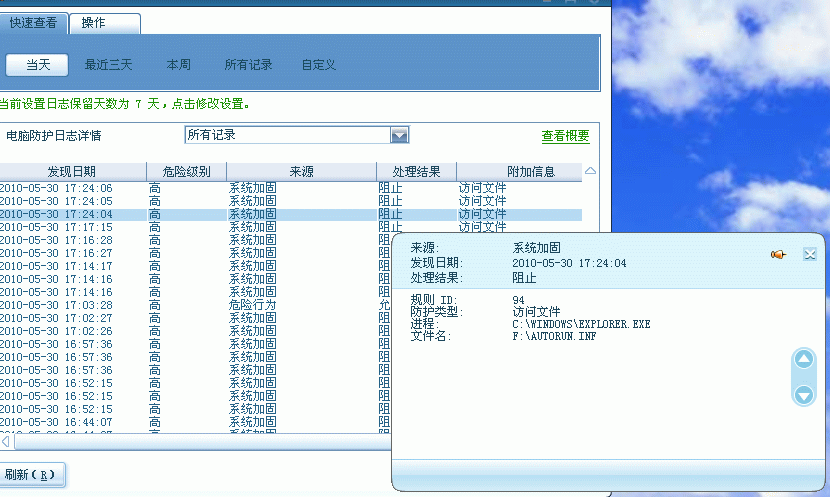 此外,在瑞星杀毒的系统加固中看到,C\D\E\F盘里都有AUTORUN.INF一天之内访问了无数次的explorer.exe,但都被阻止了,但我搜查了这些夹却又没找到AUTORUN.INF这个文件,是否这个AUTORUN.INF就是病毒?