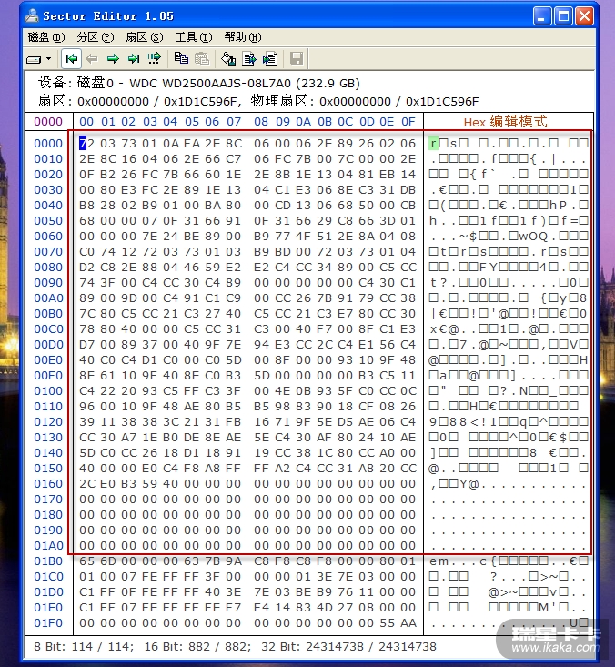中毒后,用sectoreditor查看硬盘0面0道扇区可见:主引导记录被病毒篡改;主引导扇区后面的多个扇区被病毒写入恶意代码: