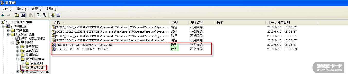 1、在“软件限制策略”中设置“散列规则”,禁止病毒程序124.txt及112.txt运行。