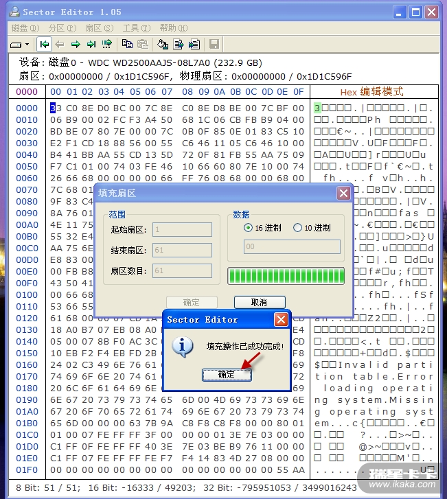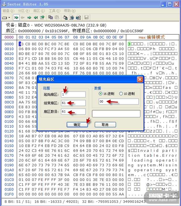 4、如果你是洁癖,不愿0面0道的其他病毒代码在你眼前晃来晃去,可以用sectoreditor将0面0道1-61扇区填0: