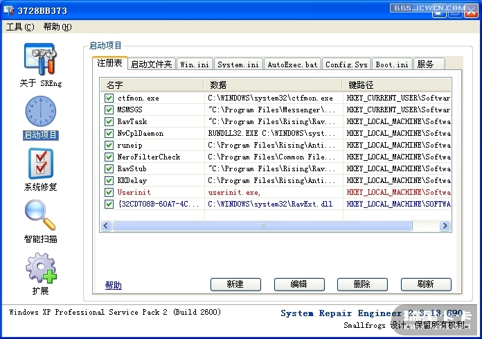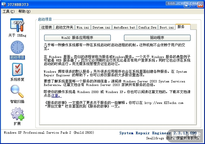 建议楼主使用System Repair Engineer扫描日志,将日志作为附件上传上来。下载页面:http://www.kztechs.com/sreng/download.html