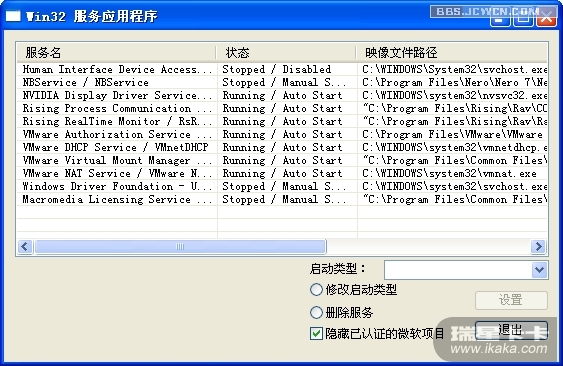 点击Win32服务应用程序,可以看全服务,为了不让微软自身携带的服务妨碍我们查找,我们选则下面的隐藏已认定的微软项目。如果删除,方法是选中驱动,然后选中删除服务,点设置就可以删除,如果禁用,点修改启动类型,然后选择启动类型为已禁用或者手动,点设置即可