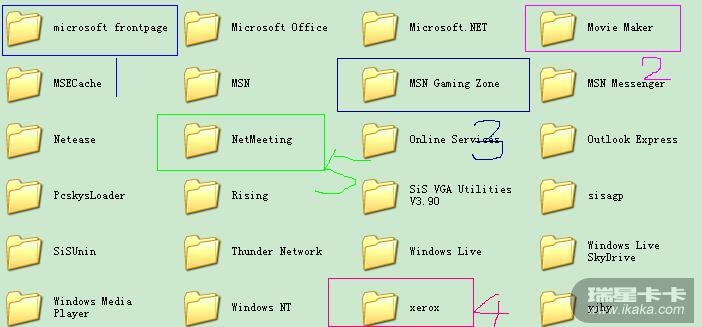 6楼已经介绍了microsoft frontpage,movie maker,msn gaming zone;现在补充下:xerox文件夹作为一些图像处理软件作临时空间用;netmeeting是Windows系统自带的网上聊天软件。
