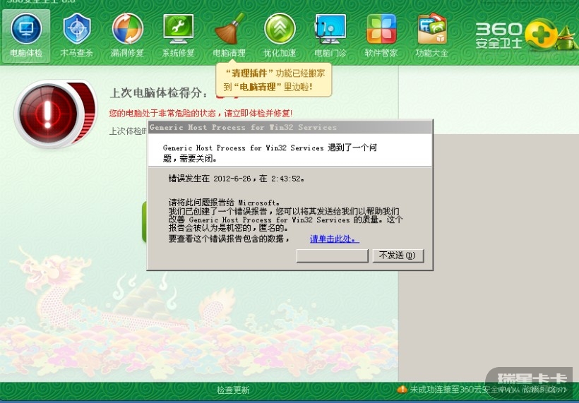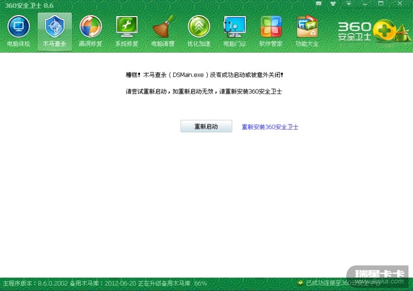 从新下载360。。。问题依旧如此。。跟上述一模一样。于是打算换上瑞星。。结果遭遇一样。一扫描。马上出现错误。系统奔溃。