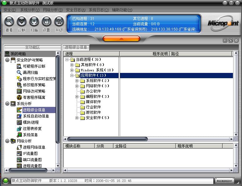 进程综合信息 - 对系统当前进程进行分类管理,显示进程的网络连接情况、端口信息、网络流量、以及每个进程的本地路径等详细信息,并显示相应进程所调用的模块信息。对可疑进程可进行“结束进程”或对其历史信息及当前信息进行查询。