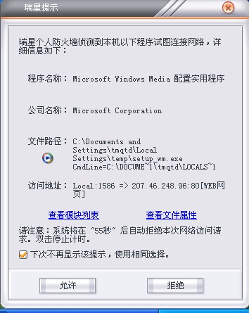 建议瑞星防火墙在阻止程序运行时增添“只允许一次”的选项