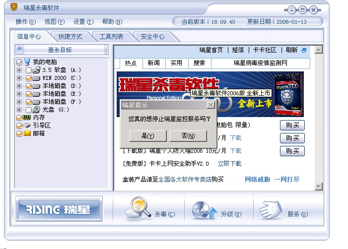 这几天一开机,要不就弹出一个框,问我是不是想停止瑞星监控服务,要不就给俺来个小红伞。请问是什么问题引起的,俺用优化大师清理一下注册表,重装N遍。结果都是一样滴。软件都是在官方下载的正版呀。请教各位好心的大大帮我瞧瞧看~