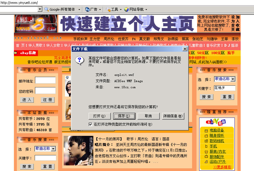 在浏览Www.yinyue8.com这个网站时,老是弹出要求下载文件的这个对话框,如图。只要进入这个主页,或者刷新一下页面,就会反复弹出来,真的很讨厌!感兴趣的朋友可以进入这个网站看一看。我也安装了珊瑚虫的Info工具栏,但是好象没有用。怎样做才能不弹出它,又不影响我正常的浏览呢?