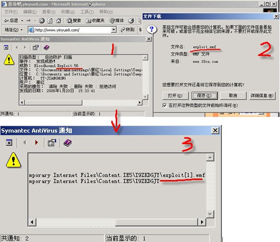 这个网页有毒吗?请大家帮忙验证一下。我在家里上网时,装的是卡巴,没有任何提示,就弹出顶楼的对话框。但我在公司打开时,装的是诺顿,除了弹出对话框外,还提示发现病毒。如图,请注意标有编号1和3的图片。