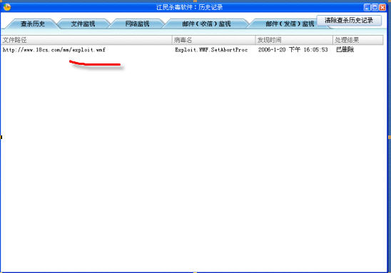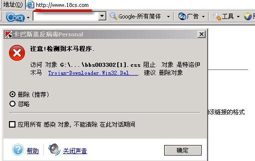 根据2楼的编号为2的图片提示:该下载文件Exploit.wmf来自网站Www.18cs.com,于是进入该网址,卡巴马上提示发现病毒,如图。这到底是怎么回事?