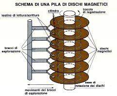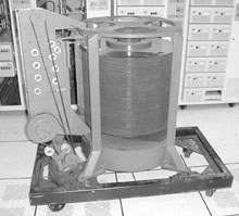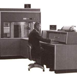 一共使用了50个直径为24英寸的磁盘,这些盘片表面涂有一层磁性物质,并且堆叠在一起,通过一个传动轴承是他可以顺利的工作(真想看看那个时候的电机有多大。)盘片由一台电动机带动,只有一个磁头,磁头上下前后运动寻找要读写的磁道。盘片上每平方英寸的数据密度只有2000bit,数据处理能力为1.1KB/s。