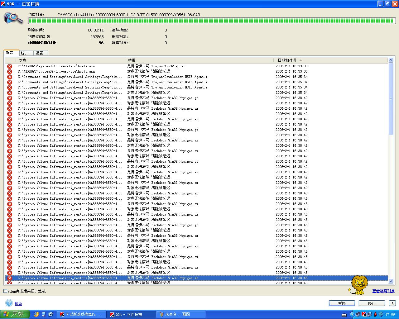 我用瑞星扫描了N次都没有查出来毒啊,安装了卡巴后扫出来50多,但可惜都杀不了,请大家看看,指教一二。