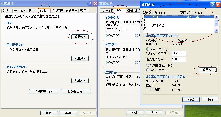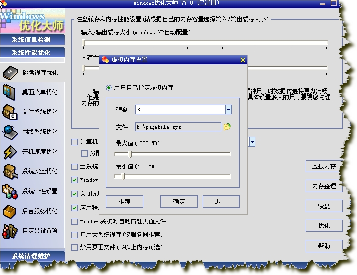 对于虚拟内存文件,Windows XP为了安全默认值总是设的很大,浪费了不少的硬盘空间,其实我们完全可以将它的值设小一点。方法是:进入“控制面板/系统/高级/性能/设置/高级/虚拟内存/更改”,来到虚拟内存设置窗口,首先确定你的页面文件在哪个驱动器盘符,然后将别的盘符驱动器的页面文件全部禁用。建议你把它是设置到其他分区上,而不是默认的系统所在的分区,这样可以提高页面文件的读写速度,有利于系统的快速运行。根据微软的建议,页面文件应设为内存容量的1.5倍,但如果你的内存比较大,那它占用的空间也是很可观的,所以,建议如果内存容量在256MB以下,就设置为1.5倍,最大值和最小值一样,如果在512MB以上,设置为内存容量的一半完全可行。