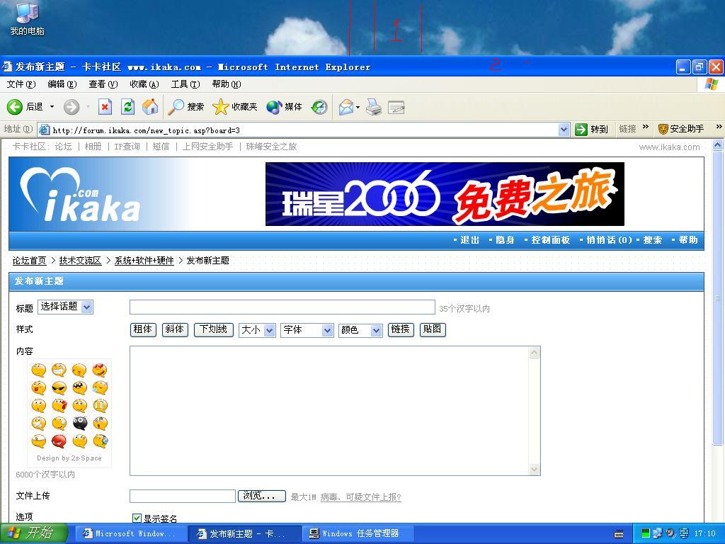 如图,打开IE最大化后,IE距桌面上端还有一段距离,无论如何调整均无法使IE占据整个桌面,用鼠标点住图中2的位置也无法向上拖动。请各位高手帮忙解决!!!!