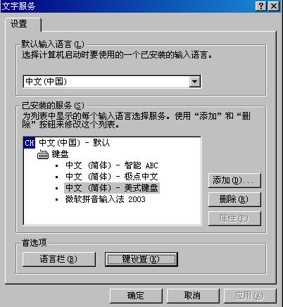 以前电脑装的Office2000,可以把任何输入法设为默认输入法。但自从我重装了Office2003后,输入法的属性对话框就变了,如图所示。现在不能设置默认输入法,微软拼音输入法自动变成了默认输入法。微软也太霸道了!我想把其它输入法设为默认输入法,怎么办?