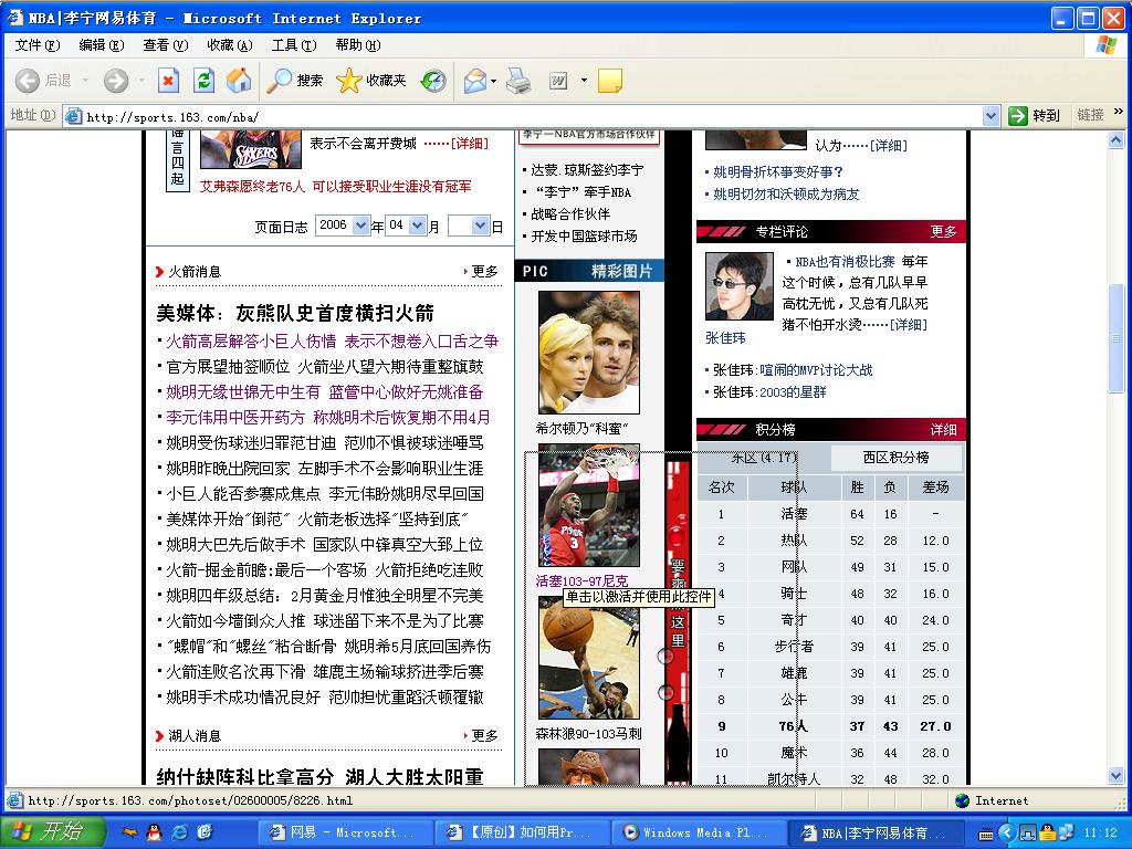 今天上了网易的NBA频道,当我的鼠标放在一幅图片上的时候,奇怪的事情发生了,出来一个虚线框,提示是"点击以激活并使用此控件",下面是截图,现在的手段是越来越高了,让你在不知不觉中就安装了控件,不知这个算不算欺骗.