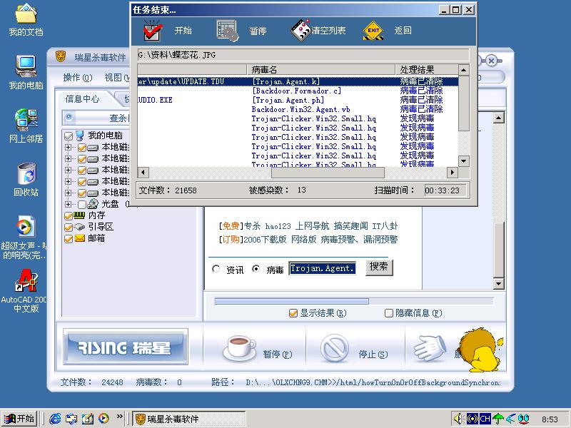 一直用瑞星杀毒软件,这一段时间老是觉得电脑有问题。瑞星又查不出病毒。今天无事,用另一个杀毒软件和瑞星对着查了一下。那个杀软查出13个病毒。而瑞星却什么都没有查出来(其实我前一天也用瑞星查过没有病毒的。)这几个病毒我在瑞星的网站上找过,上面都有。为什么还查不出来呢。我对瑞星产生了怀疑,也对那个杀软件怀疑。发上来请各位的慧眼看看,是病毒嘛。