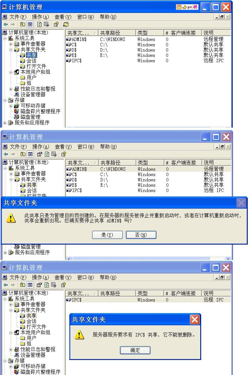 我的机子是笔记本,C.D.E.三个分区,分别有以“ADMIS$,C$,D$,E$,ICP$”为名的共享文件夹(附图1),当初安装系统盘的时候是在购买笔记本的商家处装的GHOST版本XP SP2,回来以后用瑞星杀过毒,倒是没问题,但就是无法根除这几个共享文件夹,说是为了管理而设定的,无法去掉,在计算机管理-共享文件夹选项下面搞过,可以暂时把前四个的共享解除,但提示说是为了管理而设定的,重启后会出现。果然重启后又出现上述的共享文件夹了。而第五个ICP$的那个无法解除。小弟才疏学浅,敬请高人赐教!