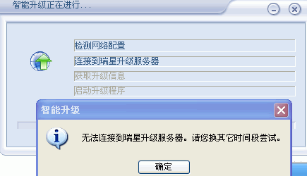我升级瑞星杀毒软件的时候,系统提示(无法连接到瑞星升级服务器。请你换其它时间段尝试)。好几天都是向这种,怎么半啊,谁交交小弟怎么做啊?