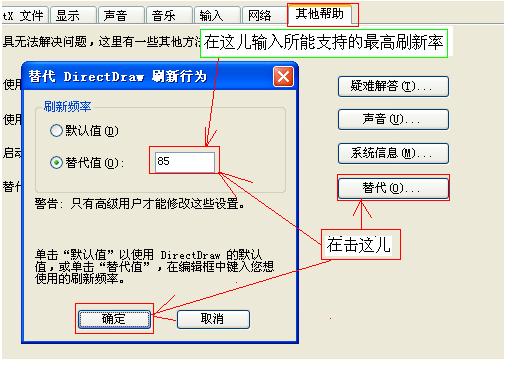 注意:在“替代值”中设置屏幕刷新率的时候,所设置的屏幕刷新频率不能超过你所使用的显示器在相应分辨率下所能支持的最高屏幕刷新率,否则会对显示器造成损坏。