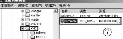 Windows Me/XP的“系统还原”虽然提高了系统的安全性,但随着不断安装软件和创建“还原点”,其还原备份文件夹(_Restor)会越来越大,浪费了大量硬盘空间。还原备份文件夹删除的方法是:在控制面板中点击“系统”选项,进入其“系统属性”对话框里将“禁用系统还原”勾选,然后打开注册表编辑器(Regedit.exe),层层进入“HKEY_LOCAL_MACHINE/System/CurrentControSet/Services/VxD”,在下面找到VXDMON主键,把它全部删除,重启后即可删除“_Restor”这个大“垃圾”文件了,如图7。