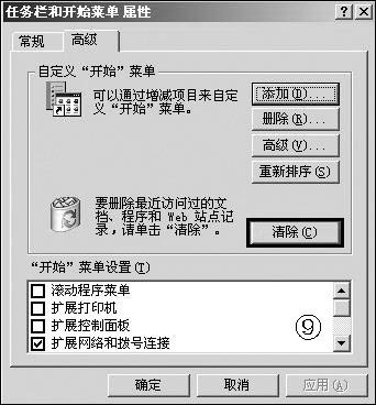 选择[开始]→[设置]→[任务栏和开始菜单],打开“任务栏属性”对话框。在该对话框中选择“开始菜单程序”标签,然后点击“清除”按钮即可,这样“文档”列表中的内容就会全部被清除,如图9