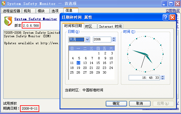 尝试改动系统时间(暂时将系统时间改为2008年6月12日),安装SSM 2.0.8.572,重启后,再将系统时间改回来。也失败了。而且,用SSM自带的卸载程序卸载SSM 2.0.8.572后,再正常安装之,重启系统后,SSM 2.0.8.572还是不能用(报错:日期不一致)。