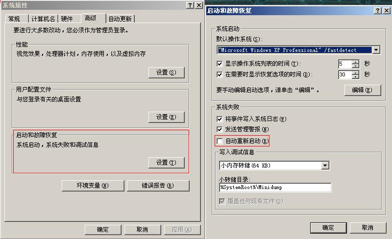 在桌面上右键点击“我的电脑”,在弹出的右键菜单中选择“属性”,弹出“系统属性”窗口,点选“高级”选项卡,点击“启动和故障恢复”栏目中的“设置”按钮,弹出“启动和故障恢复”窗口,如图1所示。在“系统失败”栏目中将“自动重新启动”选项前的对勾去掉,点“确定”按钮。(见图)