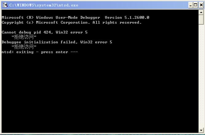 ntsd从2000开始就是系统自带的用户态调试工具。被调试器附着(attach)的进程会随调试器一起退出,所以可以用来在命令行下终止进程。使用ntsd自动就获得了debug权限,从而能杀掉大部分的进程。