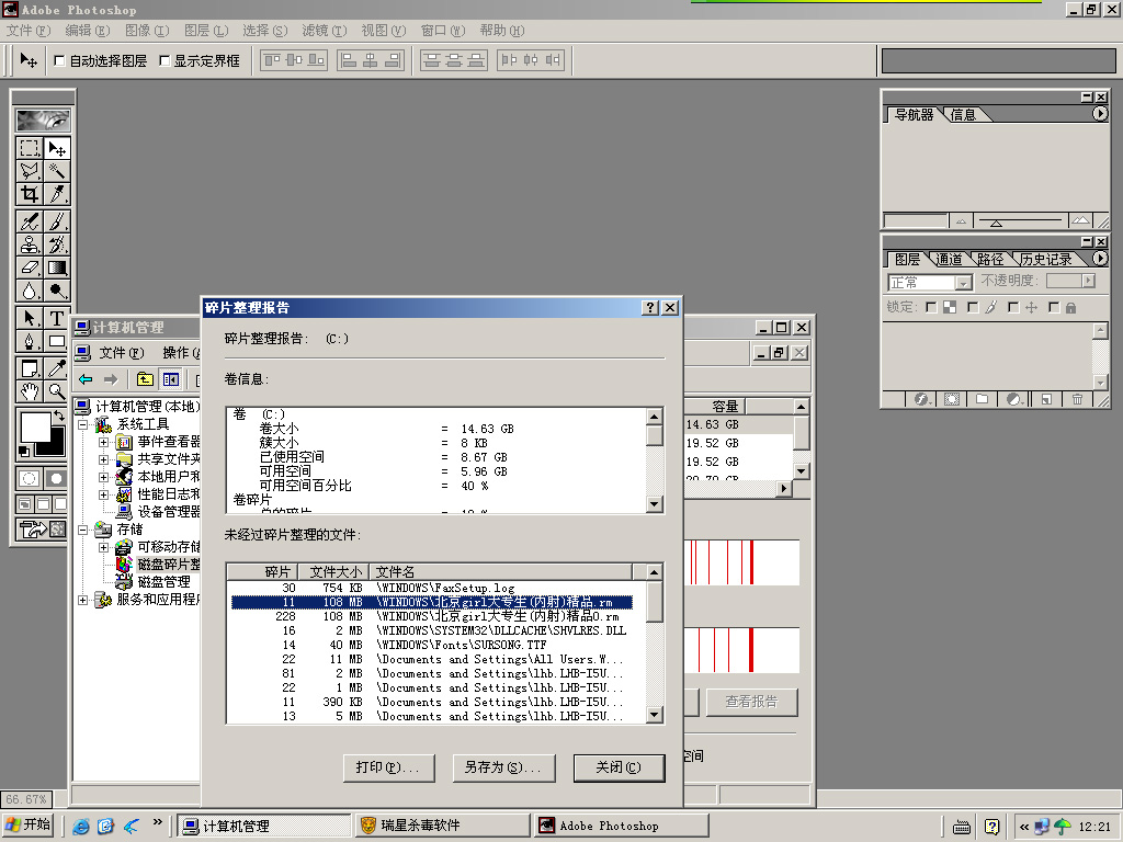 在磁盘碎片整理后显示有无法移动的文件。在C盘里有好多绿色的无法移动的文件,这些文件在那里能找到?怎样删掉?还有无法整理的碎片文件怎样处理?[img][/img]