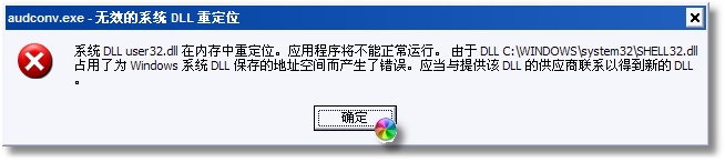 系统DLL user32.dll 在内存中重定位,应用程序将不能正常运行。由于DLL C:\windows\system32\shell32.dll占用了为windows系统DLL保存的地址空间而产生了错误。应当与提供该DLL的供应商联系以得到新的DLL "