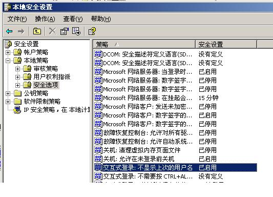在“安全选项”列表中,选择“交互式登录:不显示上次的用户名”