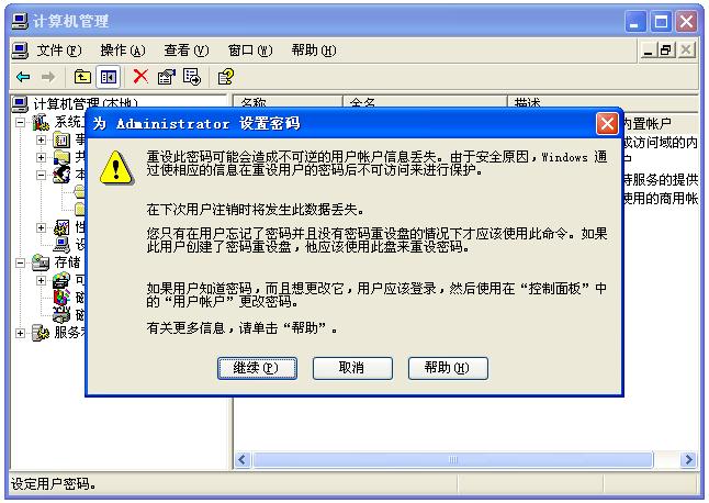 现在我的系统是XPSP2,平时我是用user这个帐户在正常状态下自动登录系统工作的(不需要输入任何密码,没有要求选择帐户登录的界面出现的),但是我在安全模式下登录Administrator这个帐户时(出现user和Administrator两个帐户供选择的登录界面),提示我要输入密码,我记得当我安装这个XP时,没有让Administrator这个帐户设置登录密码的,但是不知为什么现在从安全模式下登录要输入密码,而我又以user帐户登录在“管理工具”->“计算机管理”->“本地用户和组”->“用户”中查看Administrator帐户属性信息,没有设置过任何密码(因为右击Administrator帐户名时出现“设置密码”,点击出现如下图的对话框,我想这说明了Administrator帐户没有被设置密码),我也试过在带命令行的安全模式(在开机时按F8键可出现选择)下输入命令“net user Administrator {123}”来试图将Administrator帐户的密码变为123,待我成功登录后再次修改,但是输入命令提示命令成功完成,但是在安全模式下登录输入123这个密码不能成功登录,因为正常登录不显示Administrator这个帐户,直接登录到user帐户,所以我在安全模式下登录。