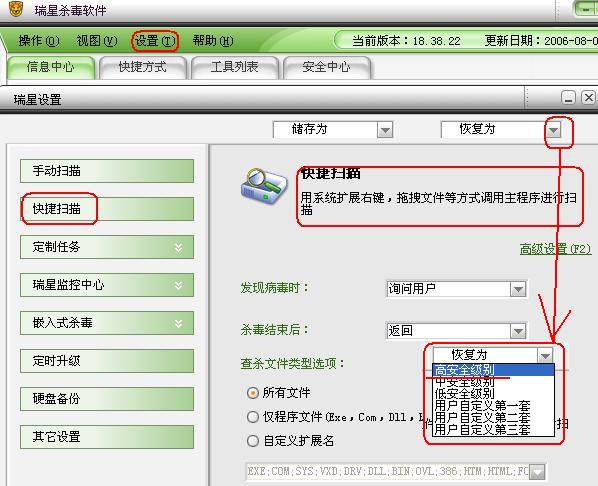如题~我系统坏了 就用GHOST恢复前备份的系统(备份前安装了瑞星) 以前还原过一次瑞星正常使用。。现在怎么右键文件查毒只打开瑞星软件而不工作了???
