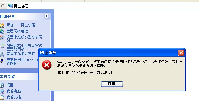 结果打开网络邻居看不到共享的文件夹内容,点查看工作组计算机显示“无法访问,您可能没有权限访问网络资源,请与这台服务器的管理员联系!”的字样!请教如何解决次问题!谢谢了!