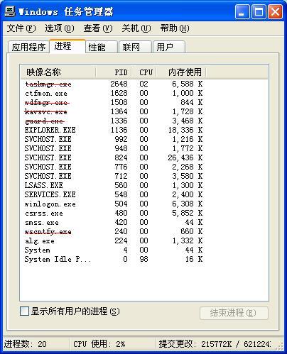 我装了Ewido和卡巴所以有guard.exe和kavsvc.exe进程,不必要的已划除.